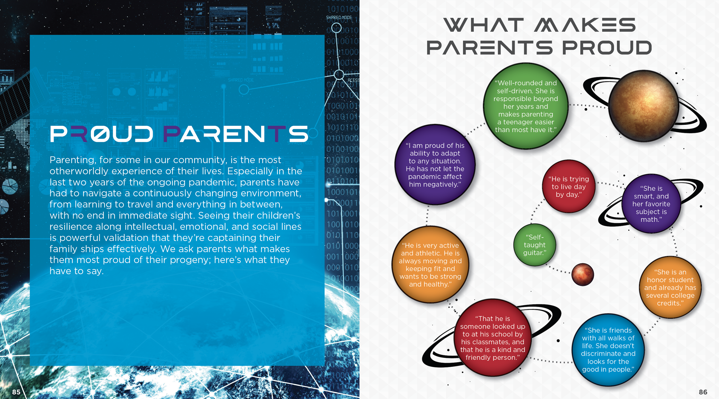 C+R Research | My role: design and layout of this 104-page book called their annual “Yearbook” representing their year’s research on youth and pop culture. Every year they use a different theme. This year the theme was outer space. These pages are a few sample pages only.